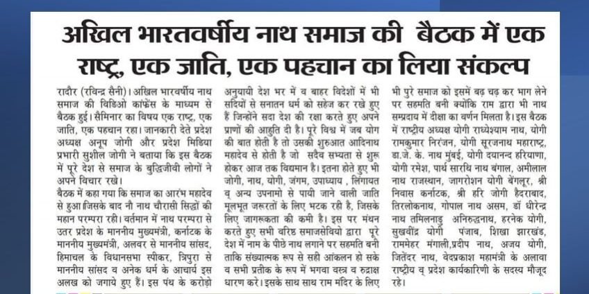 অখিল ভারতীয় নাথ সমাজের অনলাইন কনফারেন্স ১০ জানুয়ারি রবিবার অনুষ্ঠিত হয়। ভারতের সব রাজ্যের প্রতিনিধি সম্মেলনে অংশগ্রহণ করেন। সকল প্রতিনিধি এক জাতি,এক সম্প্রদায় ও একই সর্ব ভারতীয় পরিচিতির সপক্ষে সিদ্ধান্ত গ্রহণ করে। যোগিসখা সম্পাদক শ্রী পার্থ সারথি নাথ , আসাম বঙ্গ যোগি সম্মিলনীর পক্ষ থেকে এই অনলাইন কনফারেন্স এ অংশগ্রহণ করেন !